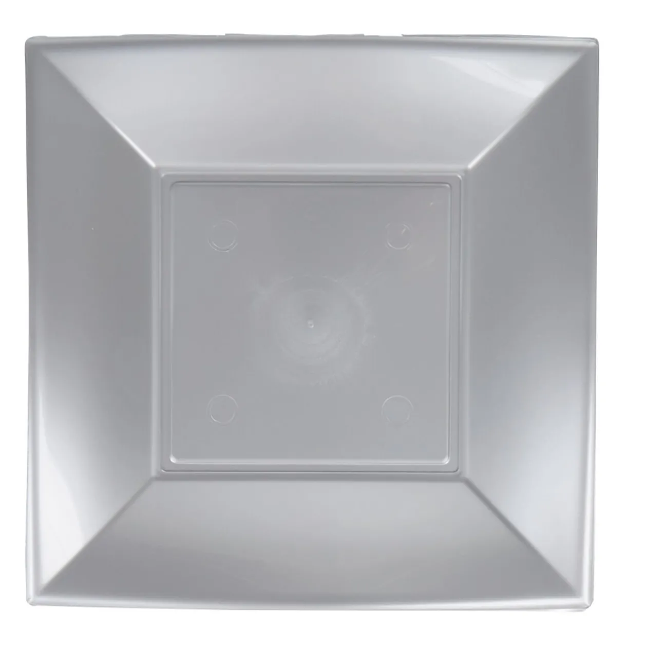 Lot de 6 assiettes jetables carrées à bord incurvé en plastique de couleur gris argenté.