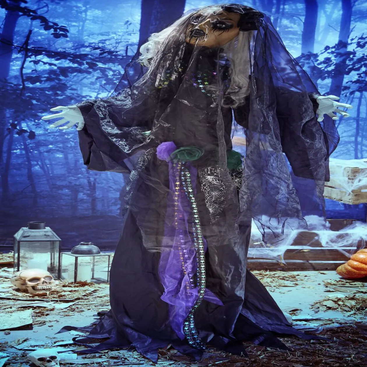 Ses longs cheveux gris tombent en mèches emmêlées autour d’elle, évoquant l’image d’une sorcière ancestrale.
