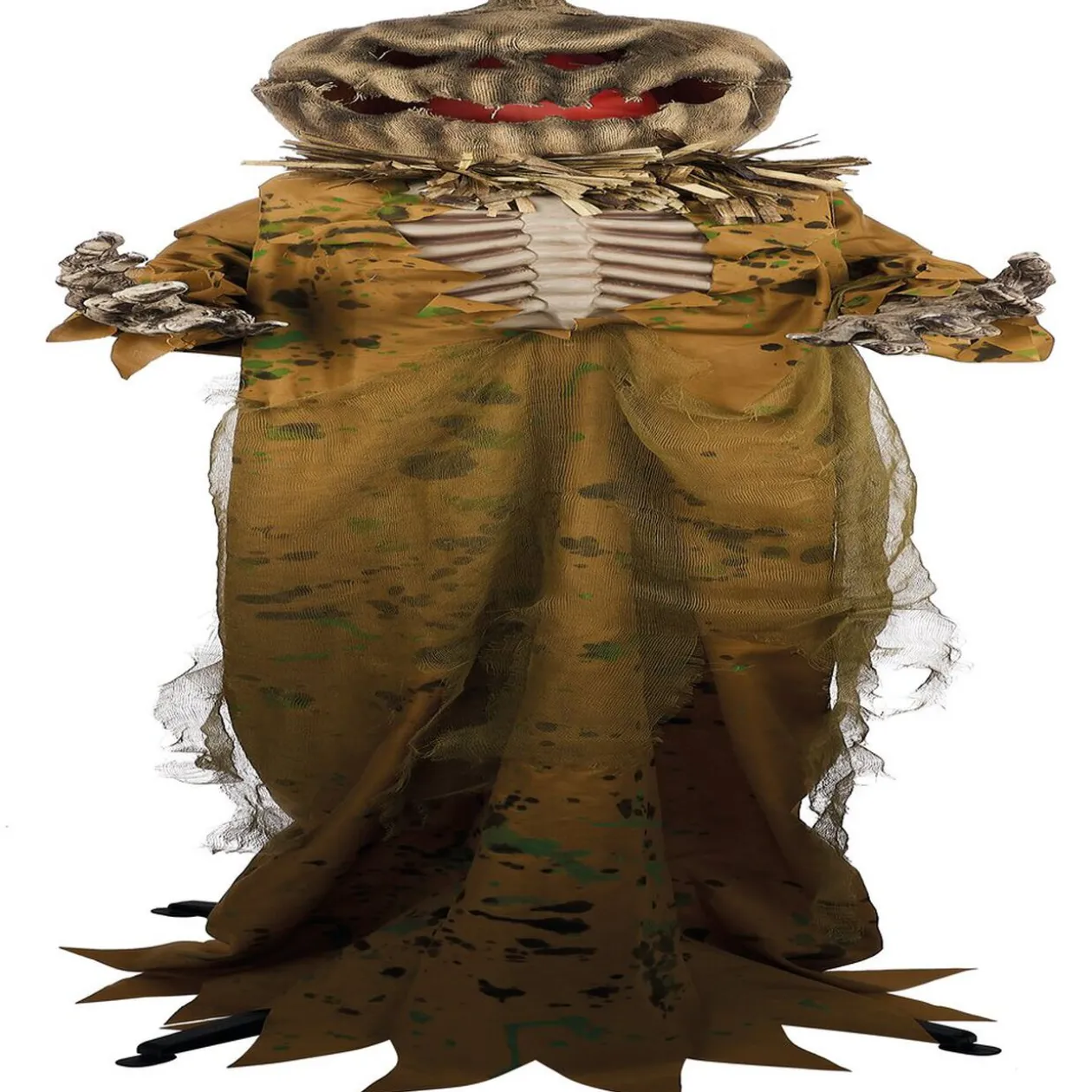 Cet épouvantail à tête de citrouille est parfait pour une décoration d’Halloween terrifiante.
