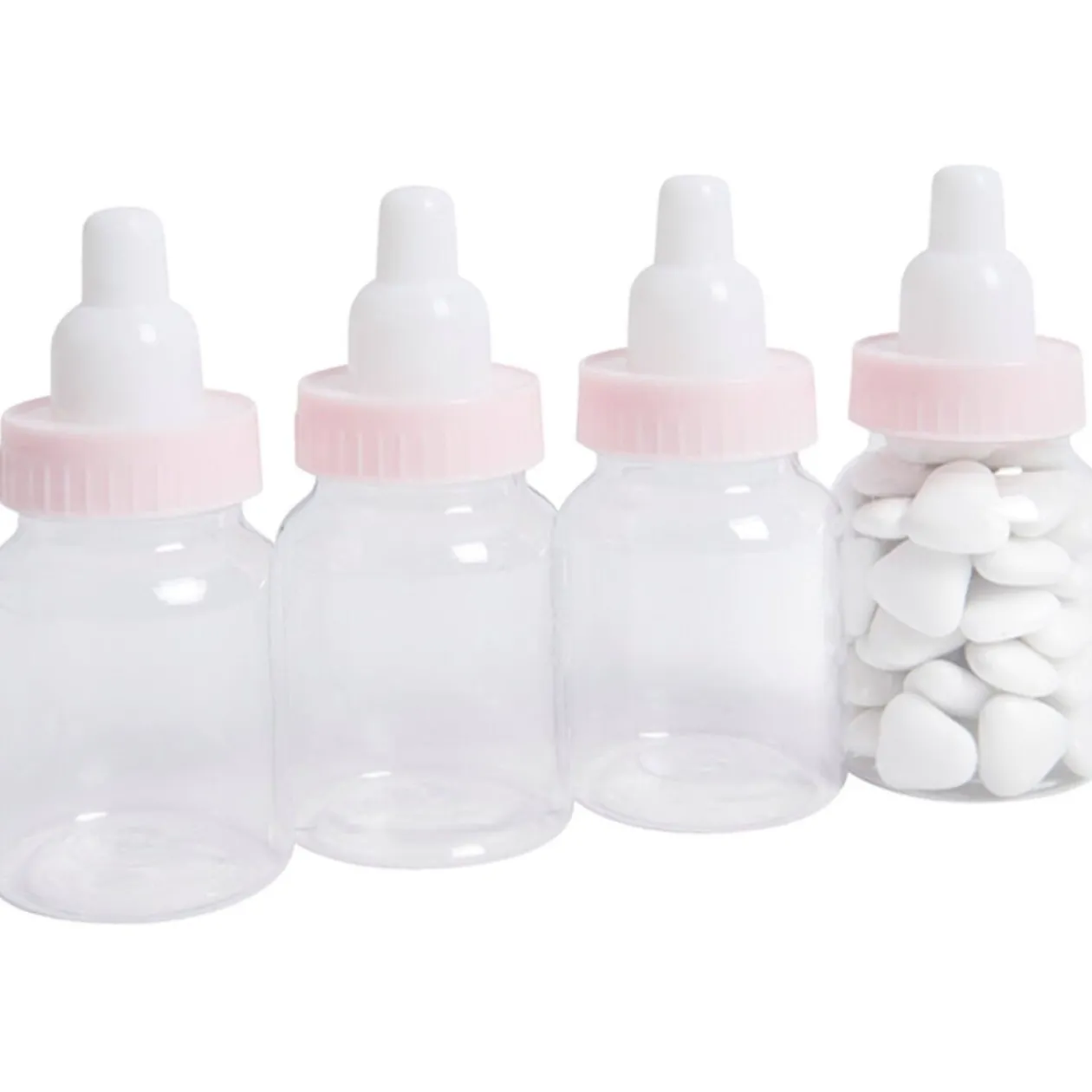 4 biberons roses, contenant à dragées, dim. h.9xø4 cm, plastique. Vendu sans dragées. Idéal pour vos évènements tels que baptême ou communion.