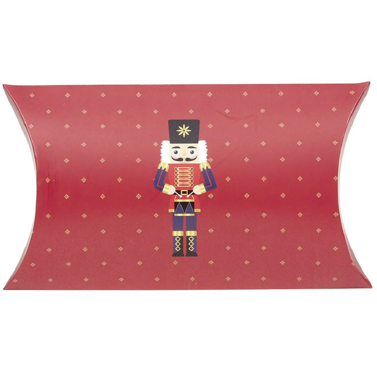 Boîte à cadeau de couleur blanche pour enfant, décorée d’un Père Noël, d’étoiles et d’un petit noeud jaune.