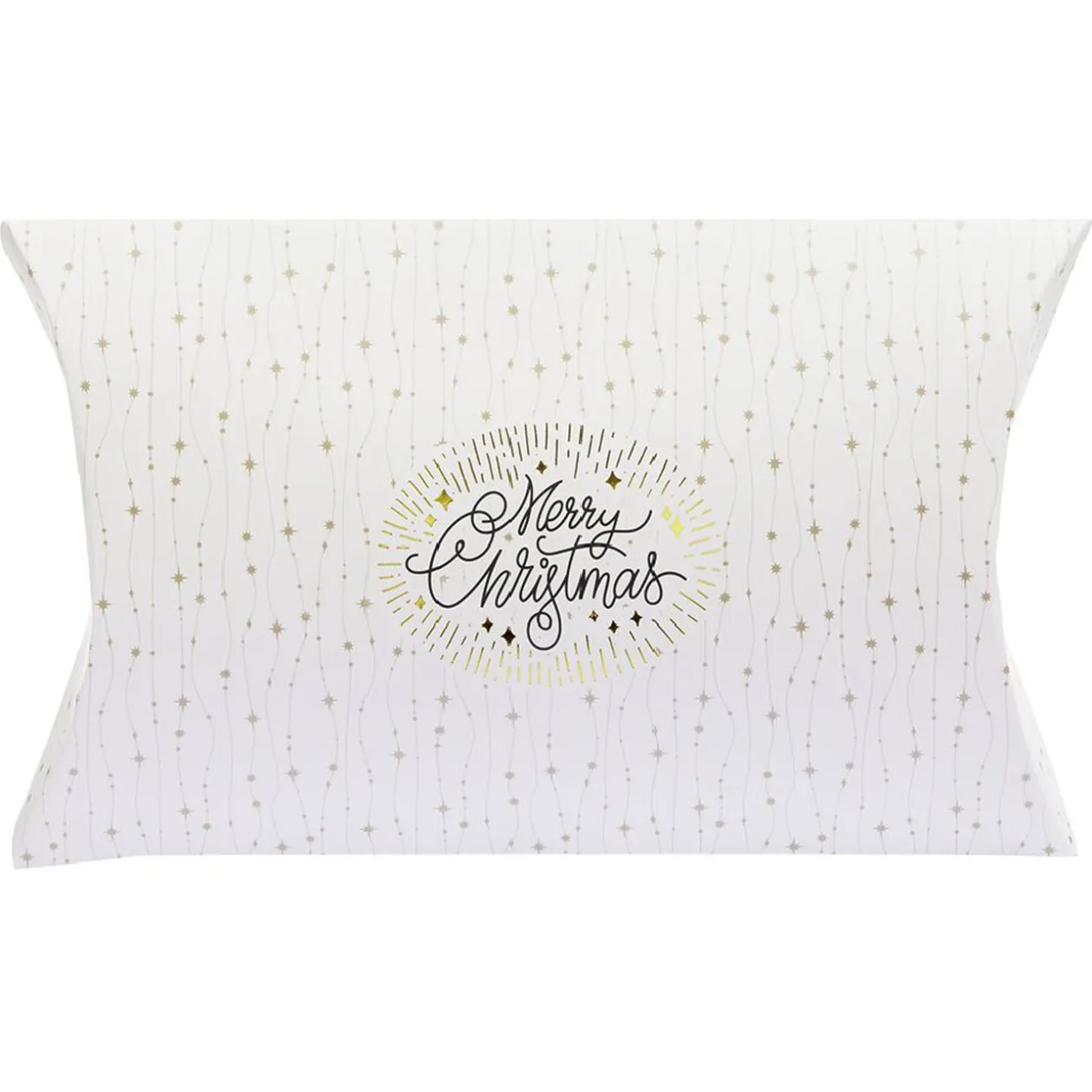 Boîte à cadeau de Noël forme berlingot à motif doré avec inscription « Merry christmas ». Idéal pour ajouter une touche de raffinement à l’emballage de vos cadeaux.