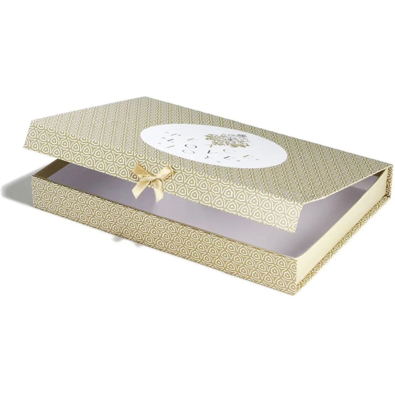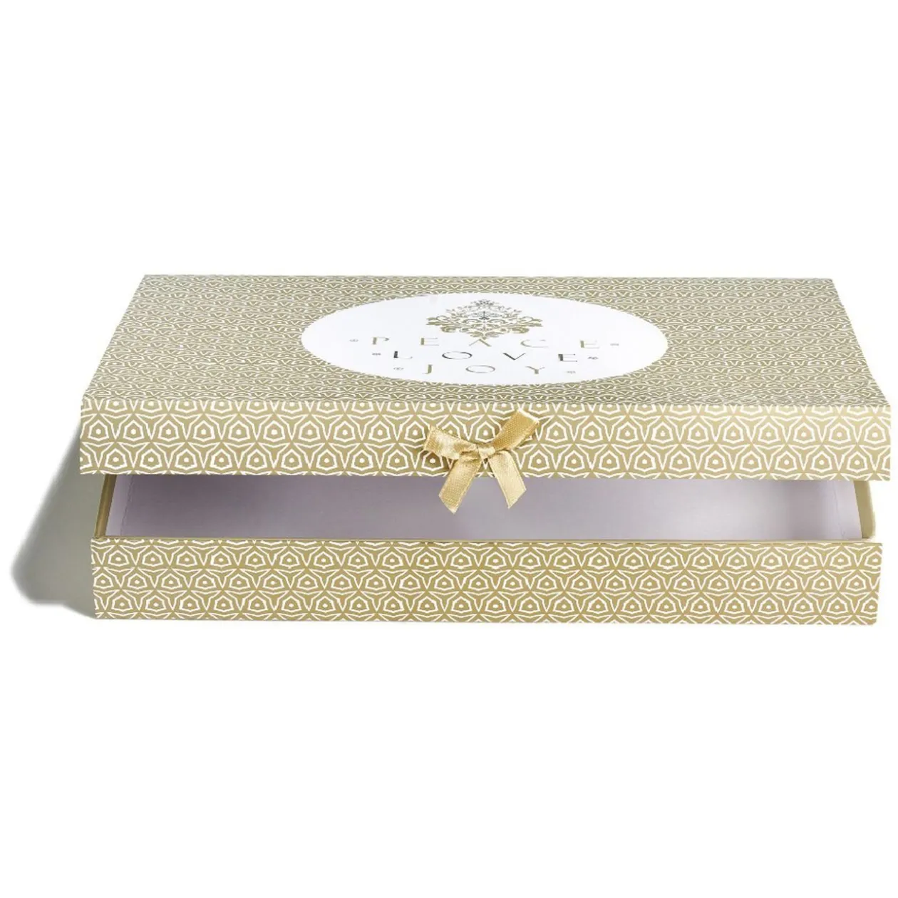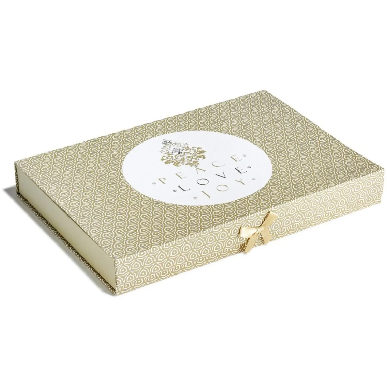 Jolie boîte en carton à motifs blancs et dorés et inscription « Peace Love Joy ».