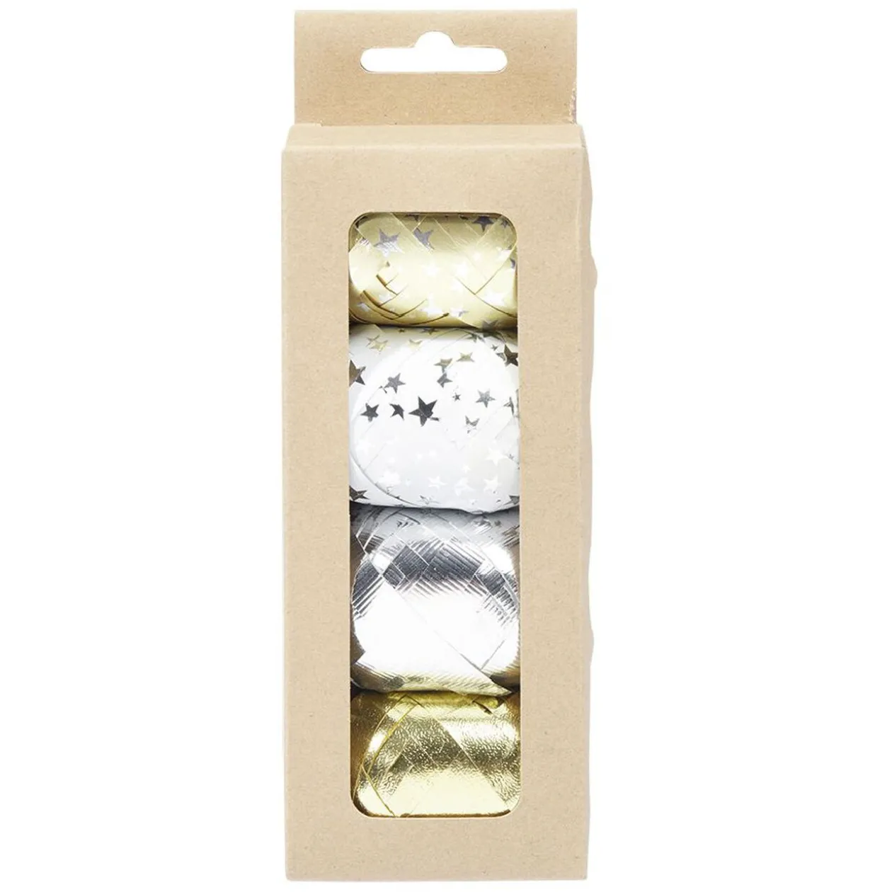 Lot de 4 bolducs métallisés dont 1 uni doré, 1 uni argenté, 1 doré/1 blanc imprimé étoiles argentées.