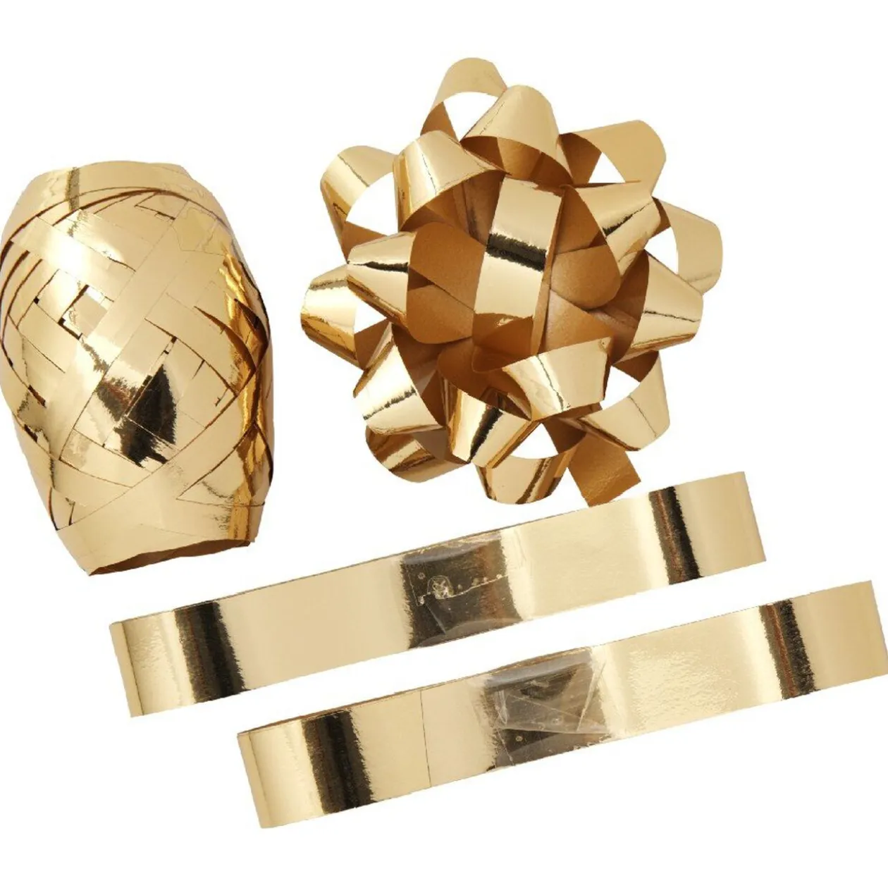 Bobine de bolduc doré de 10 m de longueur et 5 mm de largeur, noeud et 2 rubans dorés inclus, plastique.