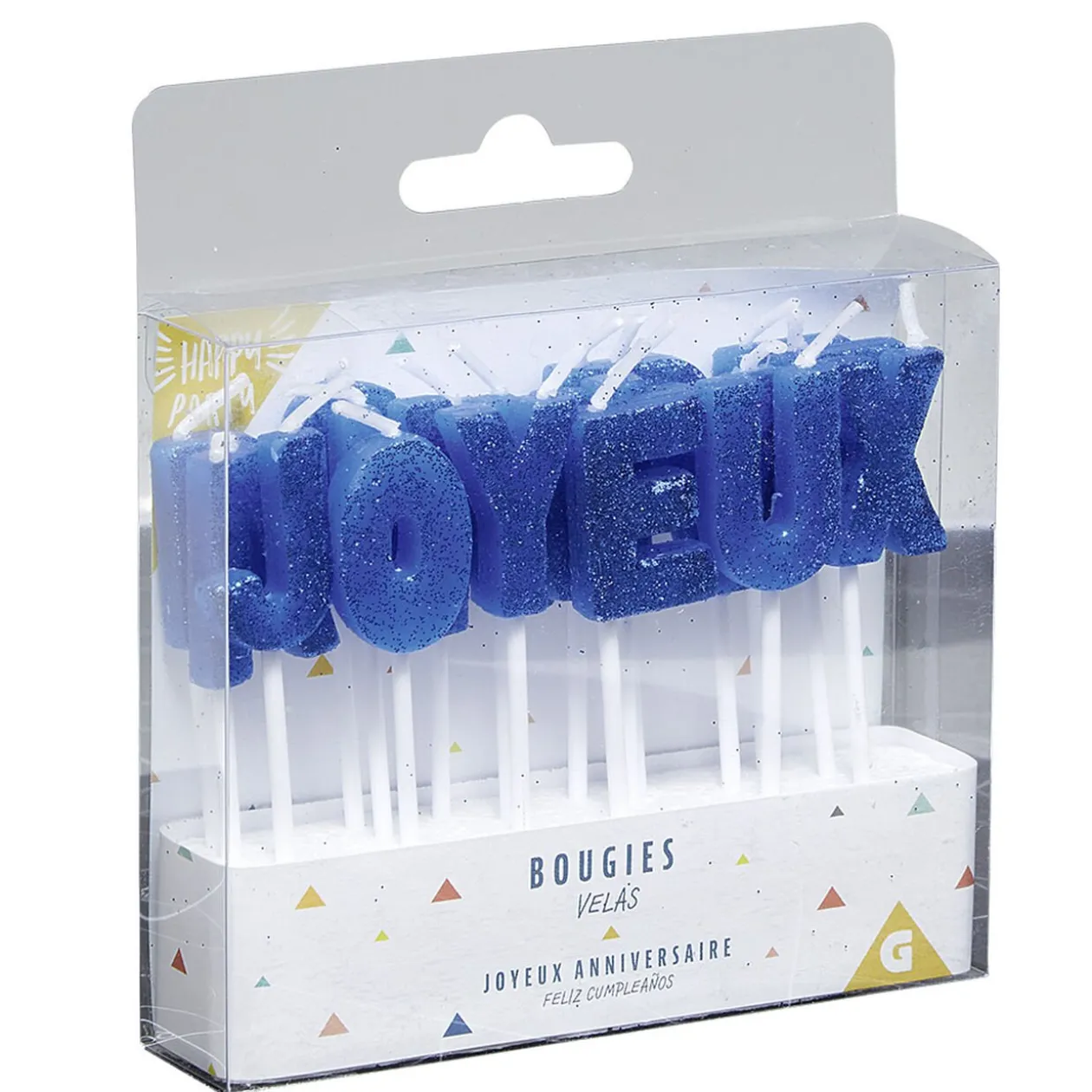 Bougies « Joyeux anniversaire » de couleur bleu à paillettes.