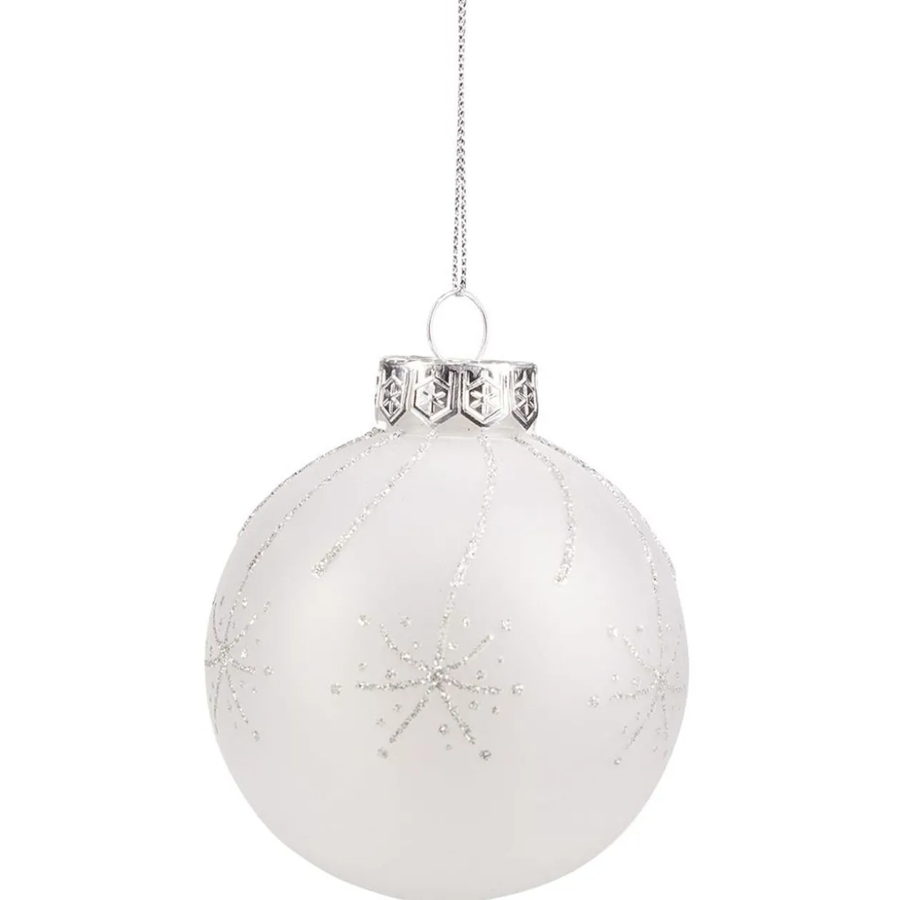 Boule de Noël blanche à motif étoiles paillettées argentées, parfaite pour compléter la décoration de votre sapin !