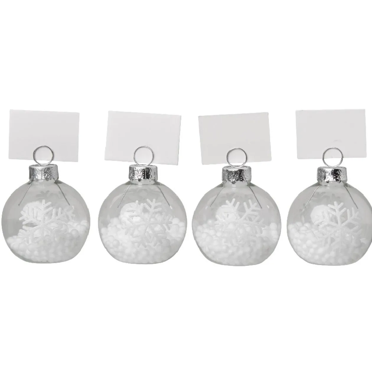 Lot de 4 porte-nom en forme de petite boule de noël transparente avec billes blanches à l’intérieur pour un effet boule de neige.