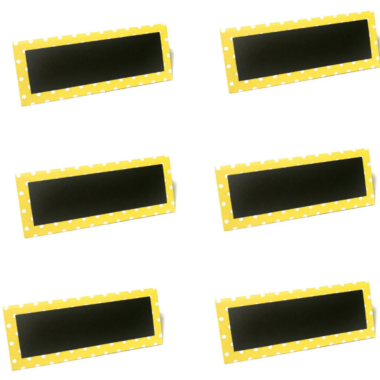 Lot de 6 chevalets marque-place en ardoise à bord jaune et pois blancs.