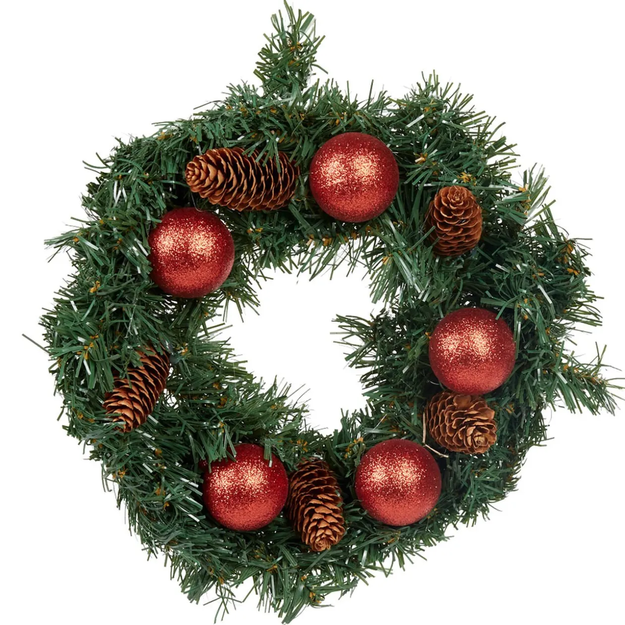 Couronne de sapin artificiel vert décorée de boules rouges et de fausses pommes de pin .