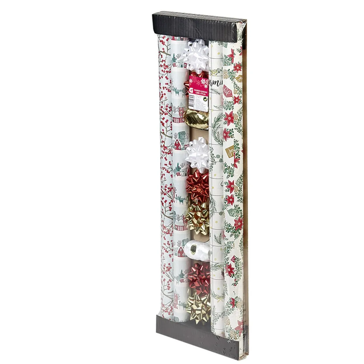 Pour emballer vos cadeaux de Noël, optez pour ce kit complet composé de 4 rouleaux de papier, 7 noeuds et 2 bolducs.