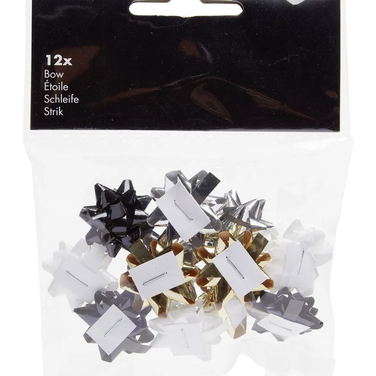 Lot de 12 petites étoiles en bolduc or, argent blanc glacé et noir métallisé.