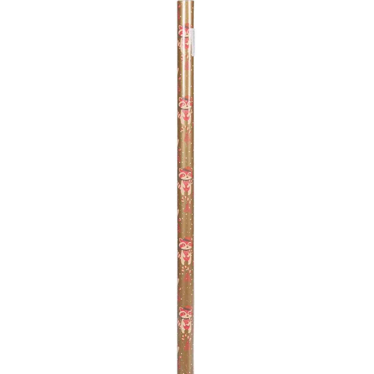 Rouleau de papier cadeau marron et rouge, motifs renards, hiboux, sucre d’orge et sapins.