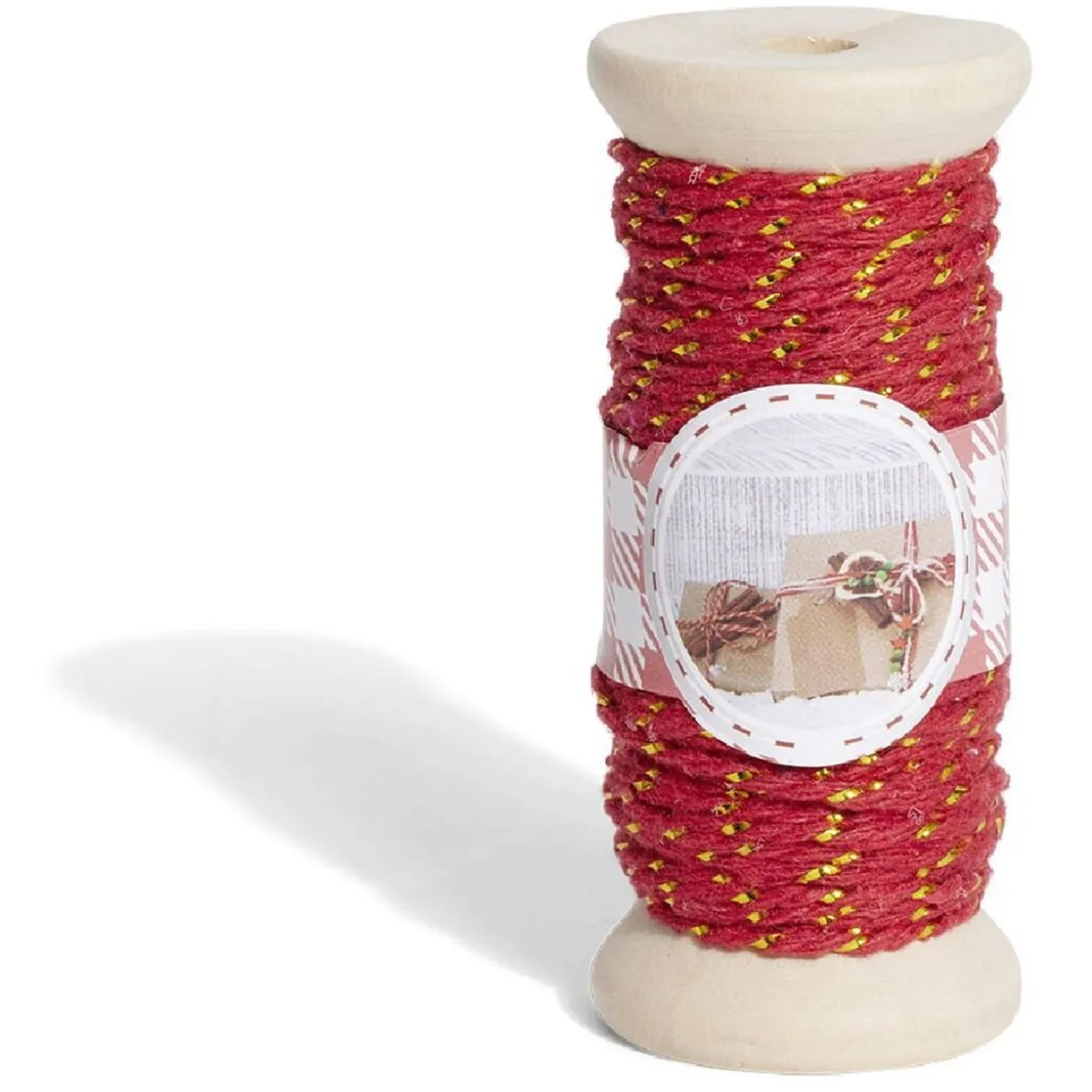Décorez vos emballages cadeaux avec ce rouleau de 15 mètres de fil de coton rouge et doré.