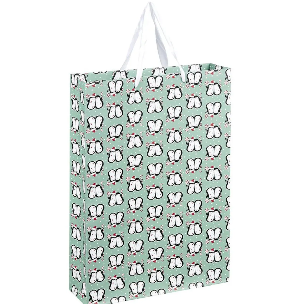 Sac cadeau de Noël taille L pour enfant, vert avec des pingouins ou rouge avec des faons.