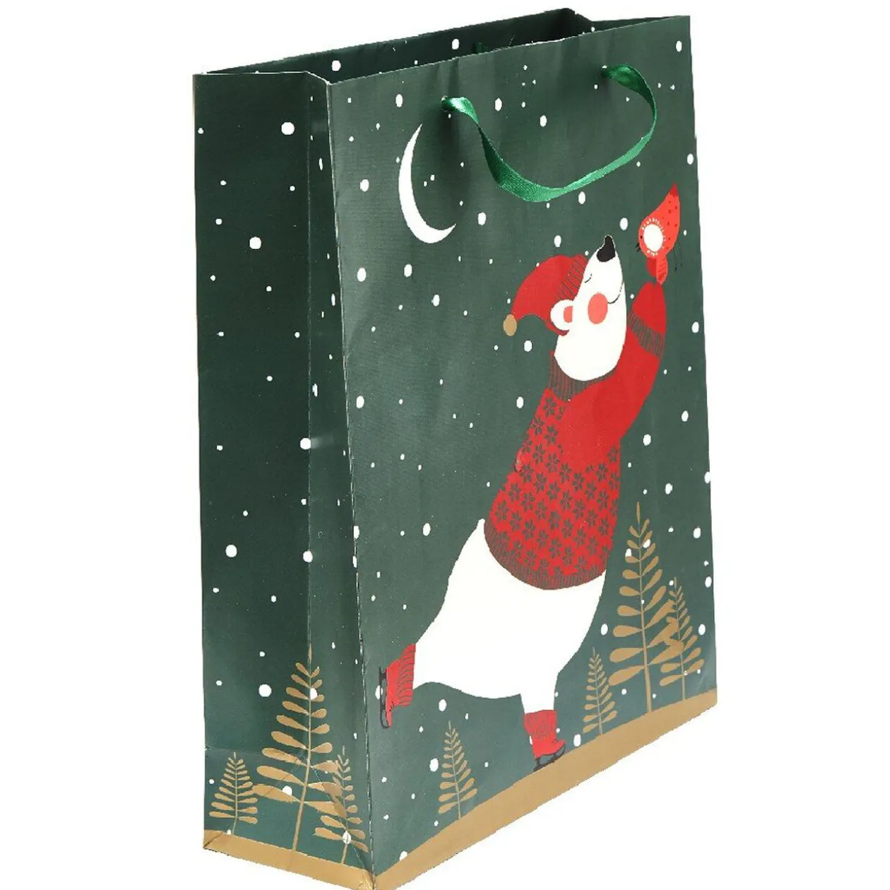 Petit sac cadeau de couleur vert représentant un ours blanc vêtu de rouge.
