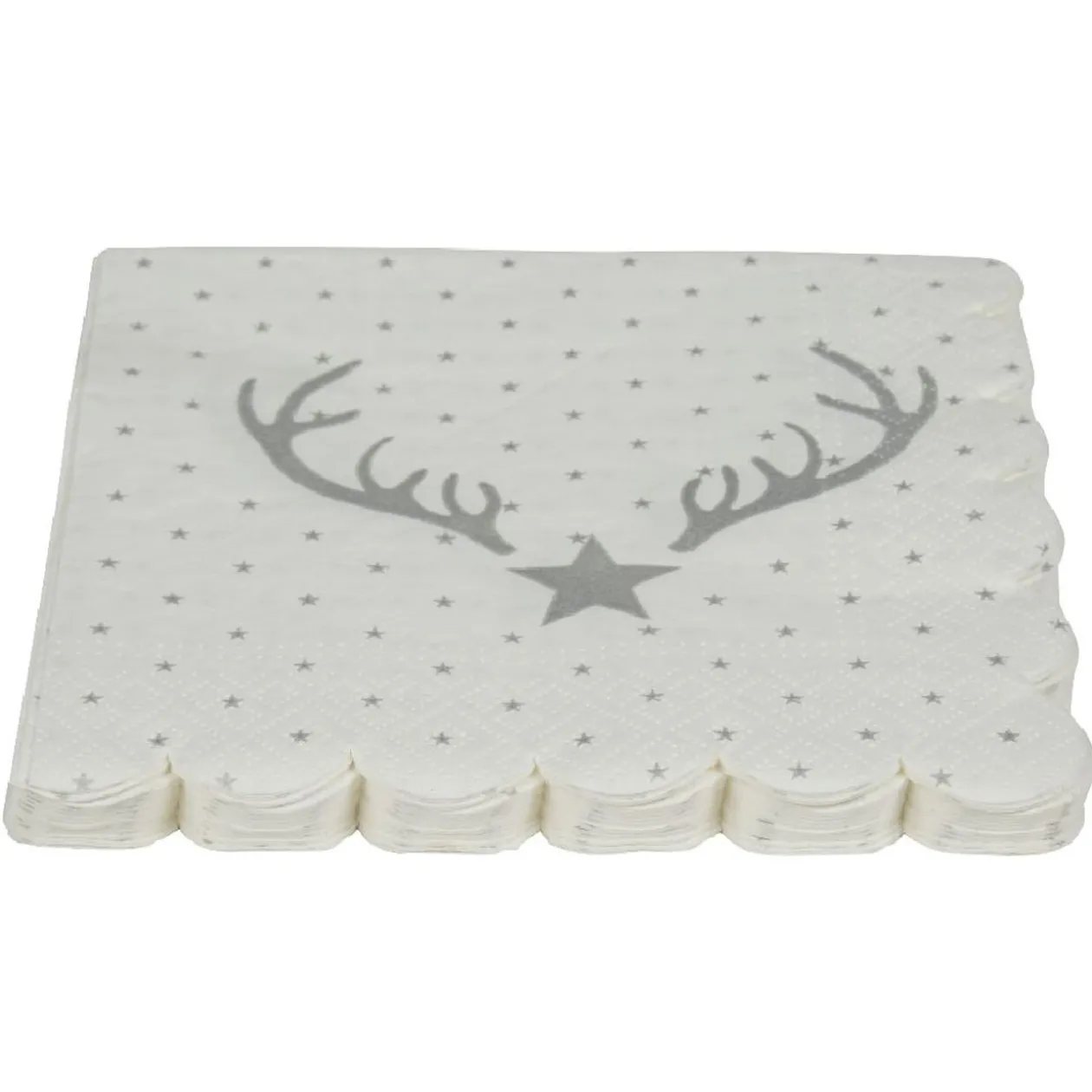 Lot de 12 serviettes dentelées en papier blanc ponctué d’étoiles argentées avec détail renne de Noël, un élément pratique et original qui fera mouche sur votre table de réveillon.