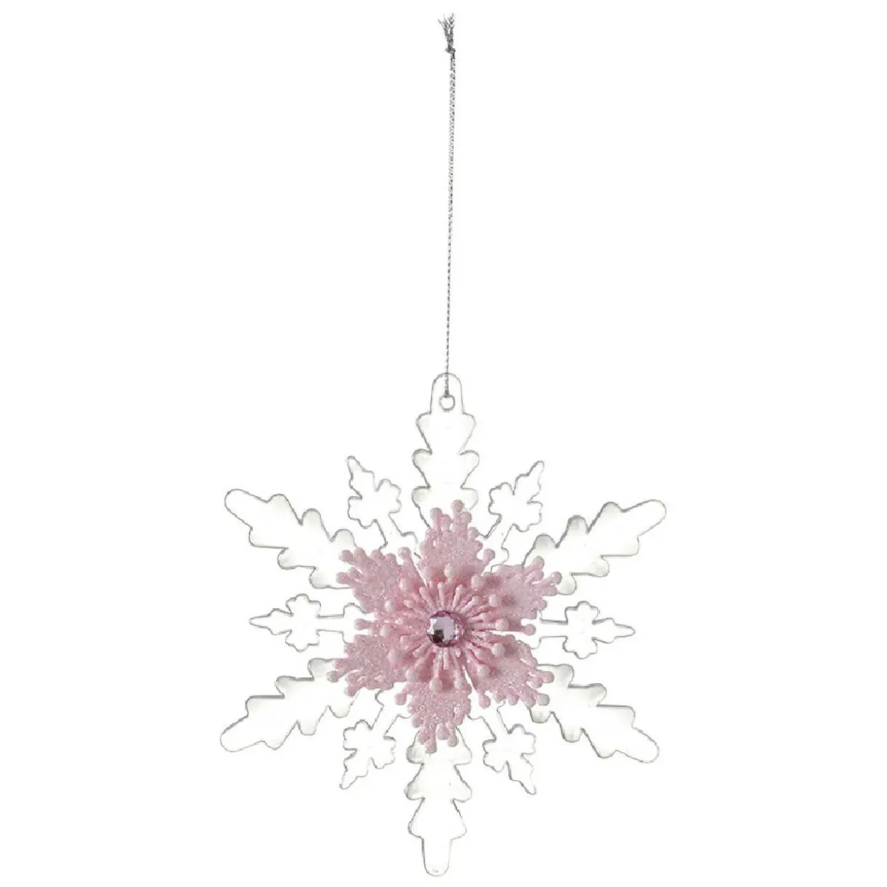 Suspension en forme de flocon rose et transparent, idéal pour apporter une délicate touche de givre et poudré à votre sapin de Noël.