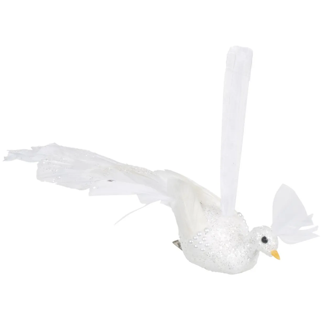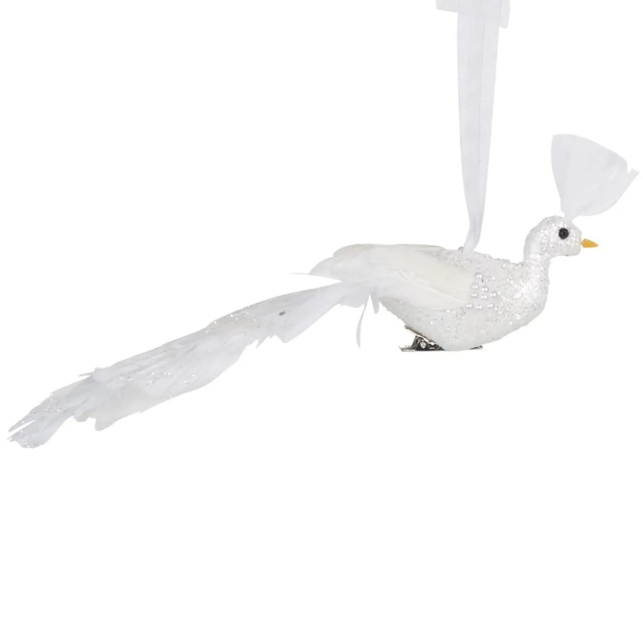 Paon blanc neige pailleté avec plumes et ruban.
