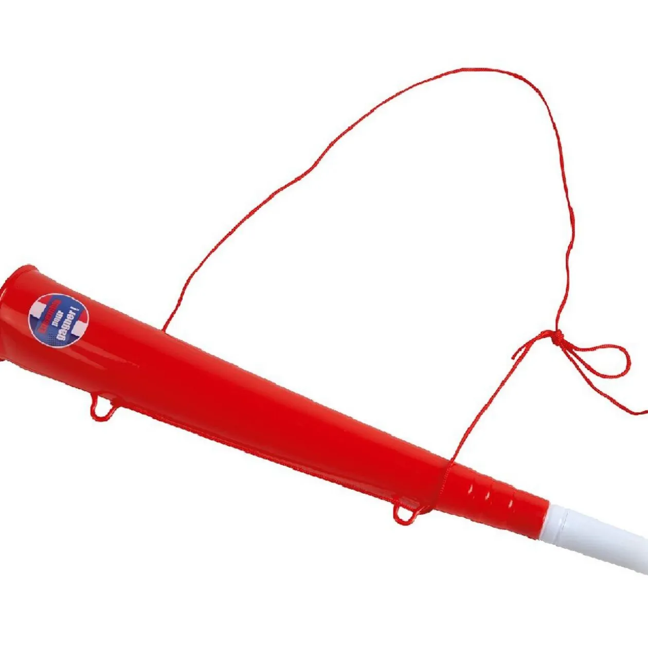 Trompette avec cordon pour supporters français, dim. 36xø5 cm, plastique.