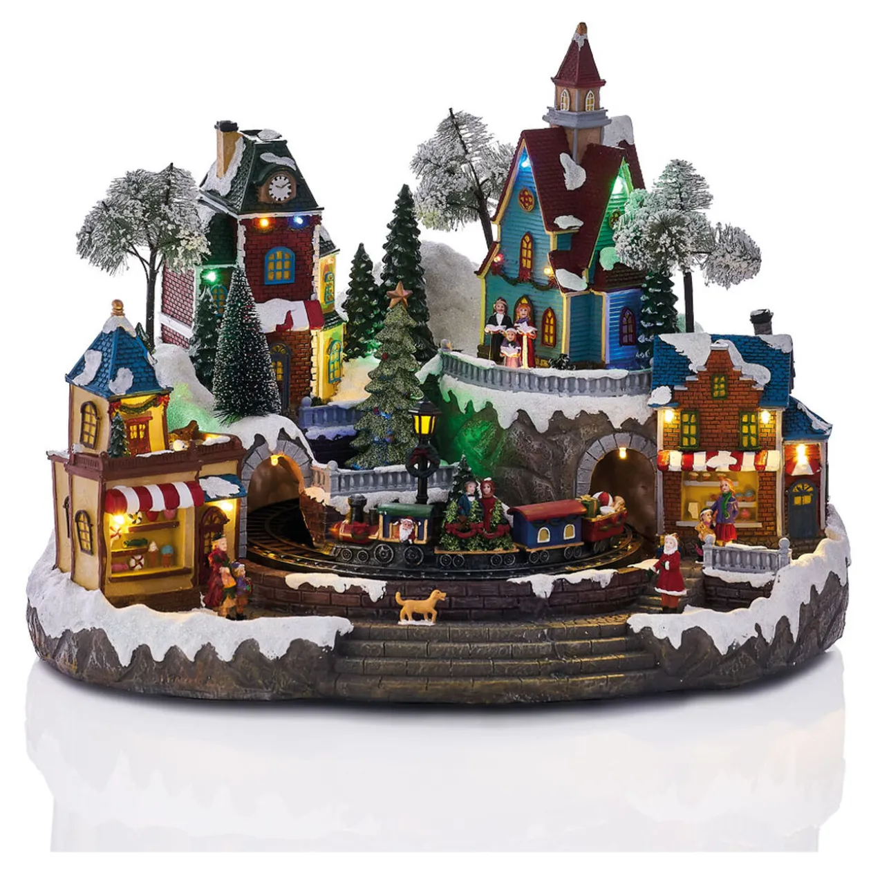 Créez une ambiance festive joyeuse dans votre intérieur en y ajoutant ce village animé musical et lumineux. Il est doté de 30 lampes LED qui illuminent les maisons et la petite épicerie complétant le décor. Un train et des sapins s’y trouvent aussi. Les sapins tournent sur eux-mêmes tandis que le train, en suivant le rythme de la musique, tourne autour du village, en passant par les tunnels.
