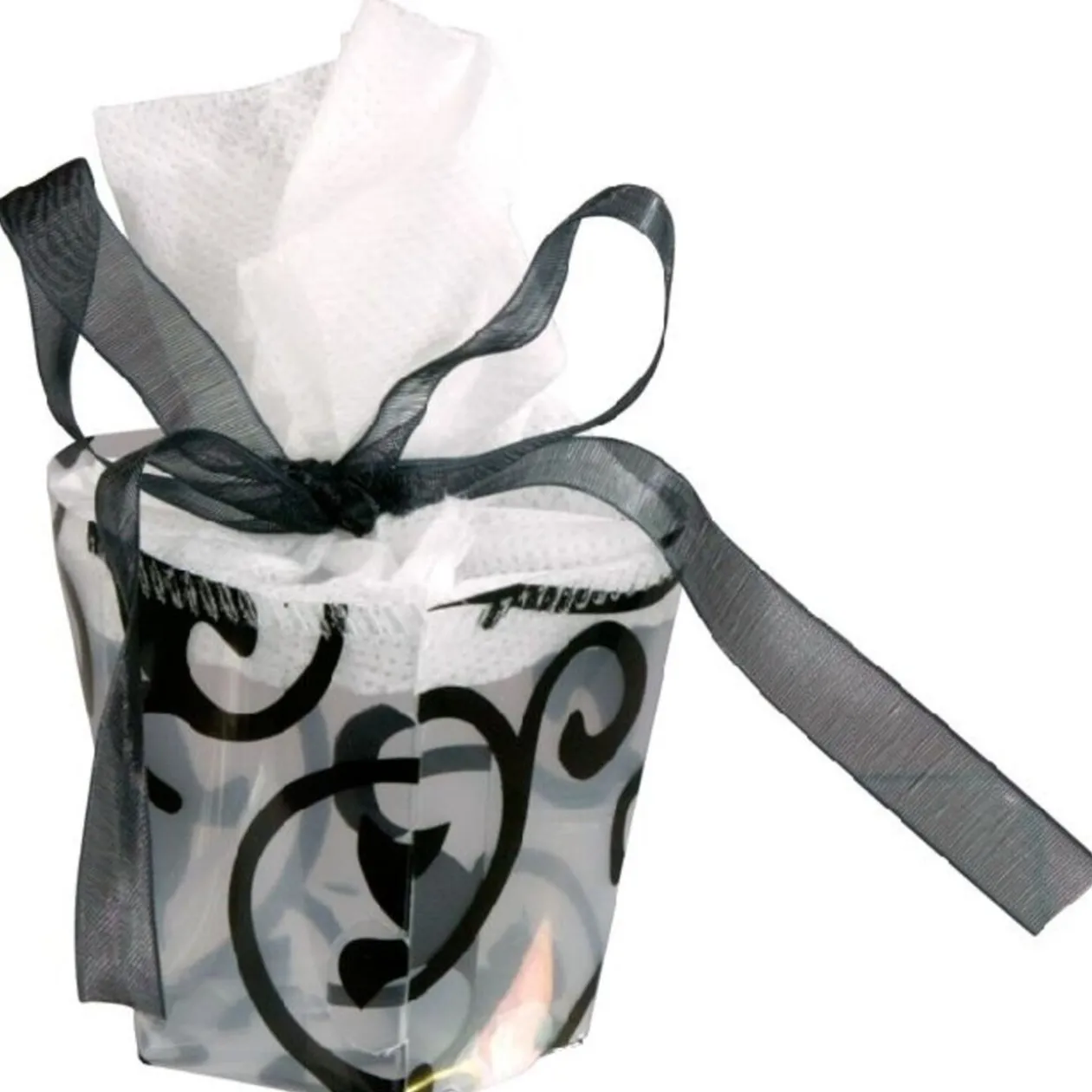 6 ballotins arabesque, Ø 4 cm, plastique, avec tulle et noeud à attacher, couleur noir et blanc.