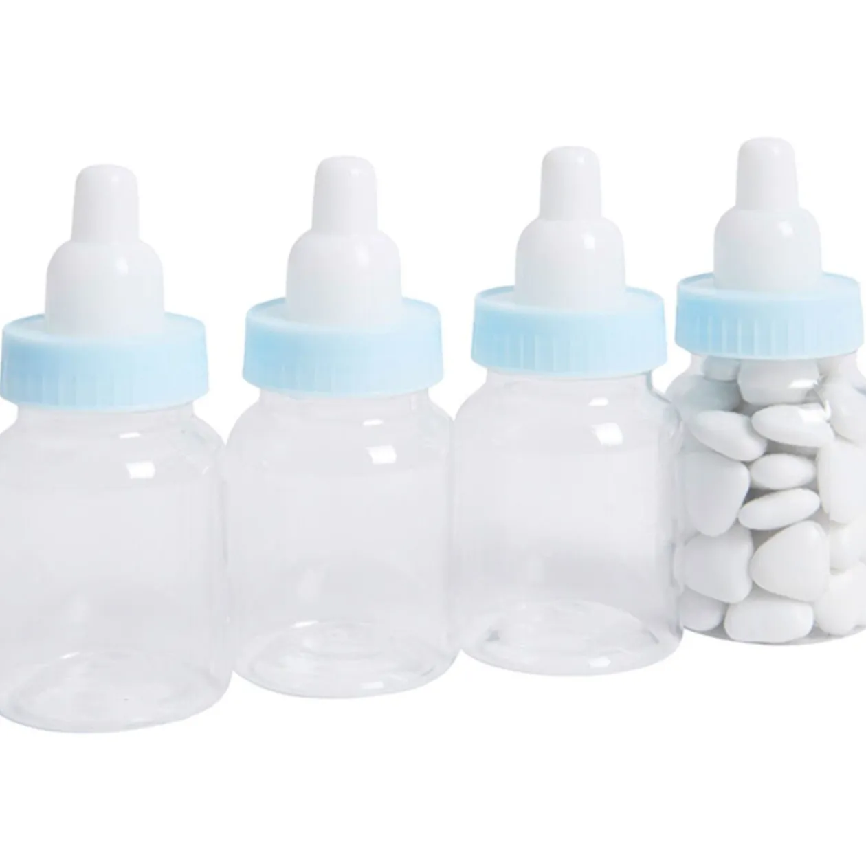 4 biberons bleus, contenant à dragées, dim. h.9xø4 cm, plastique. Vendu sans dragées. Idéal pour vos évènements tels que baptême ou communion.
