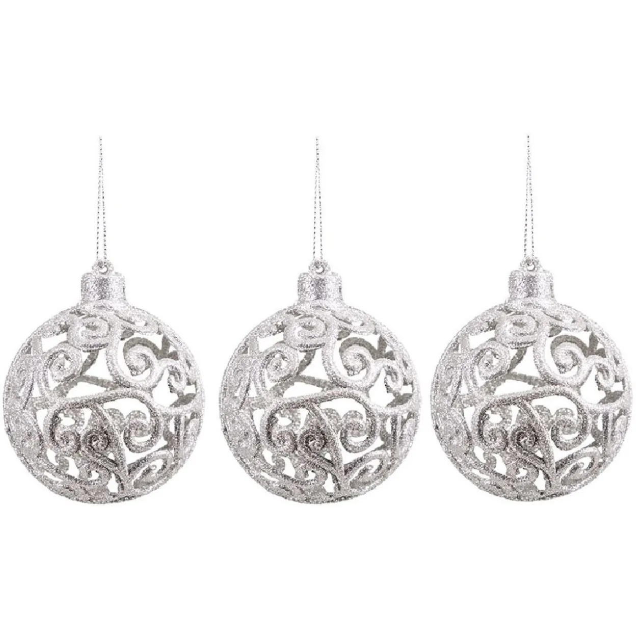 Lot de 3 boules de Noël pailletées argentées à motif arabesque, idéales pour apporter une touche chic à votre décoration ou votre sapin.