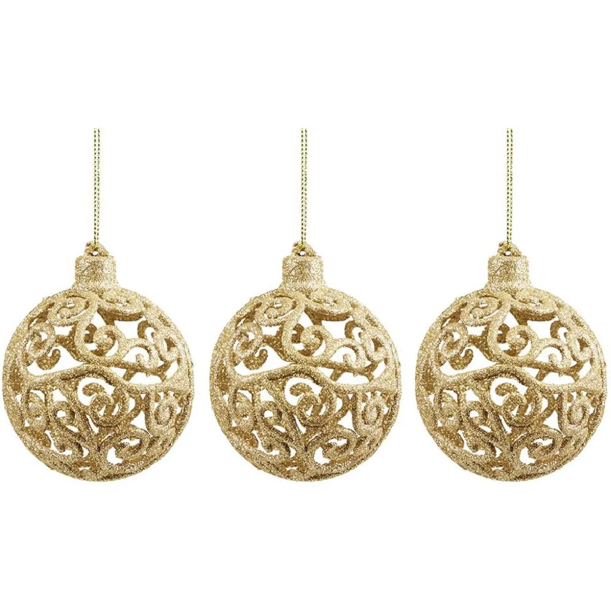 Lot de 3 boules de Noël pailletées dorées de style baroque, idéales pour apporter une touche chic àà votre décoration ou votre sapin.