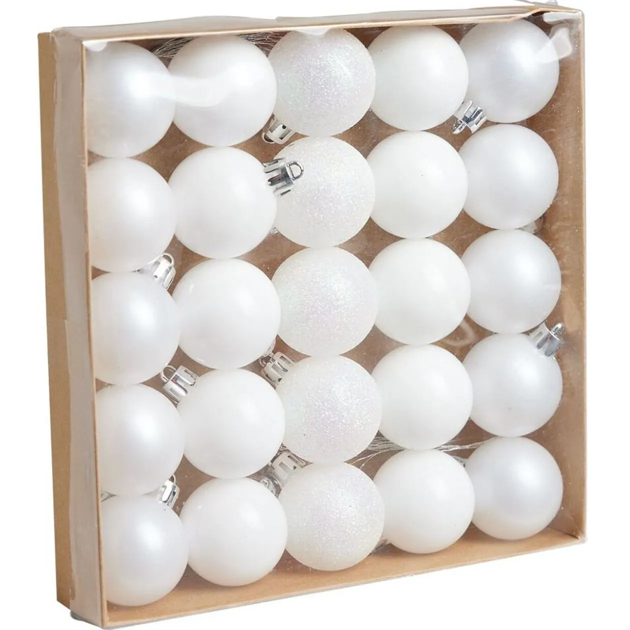 Variez votre décoration de sapin avec cet assortiment de 25 petites boules de Noël blanches, à l’aspect pailleté, givré, et brillant.