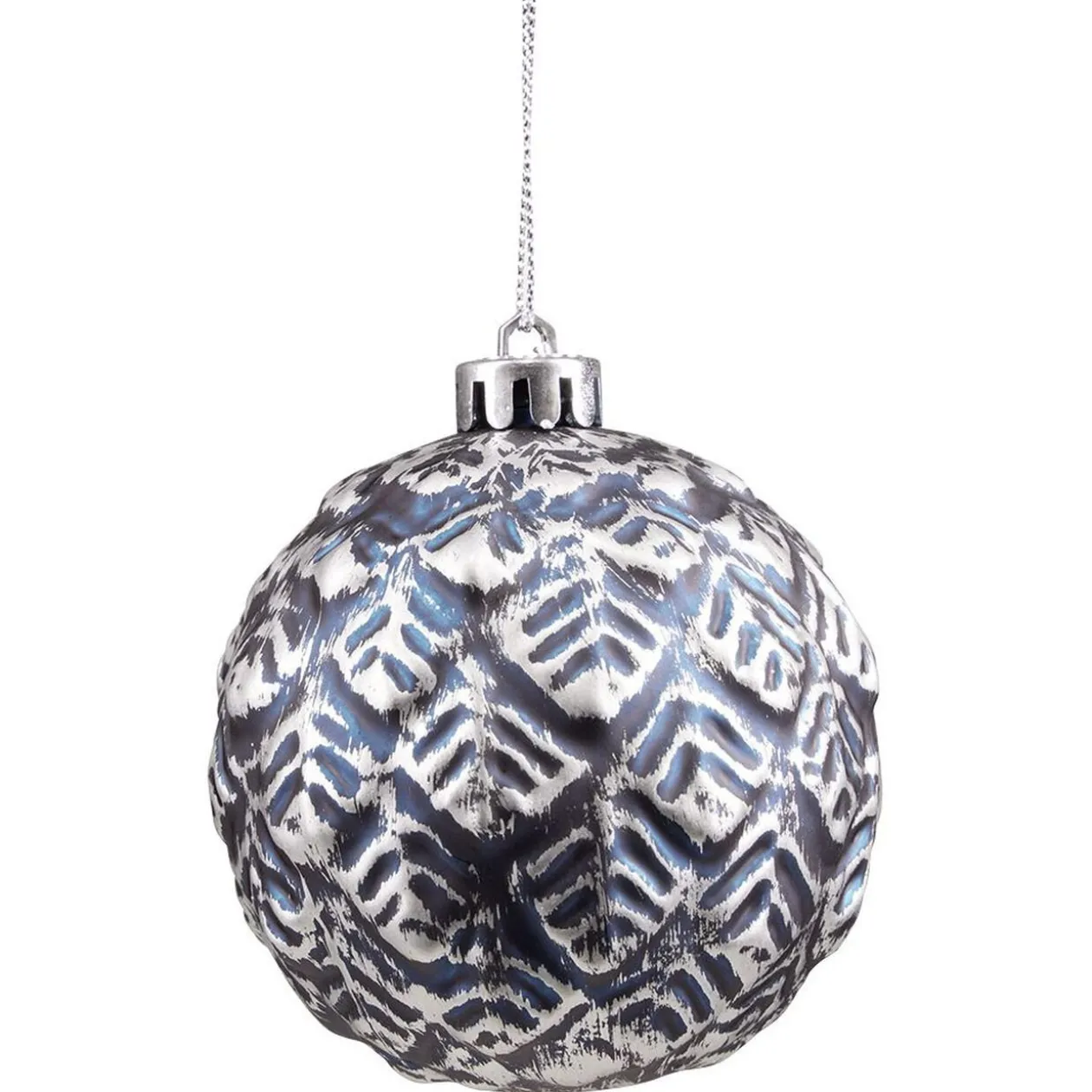 Boule de Noël bleue et argentée avec motifs en relief, parfaite pour venir compléter la déco de votre sapin !