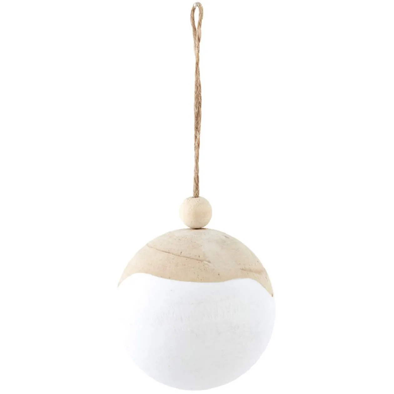 Boule de Noël en bois naturel et blanc à suspendre pour votre sapin de Noël.