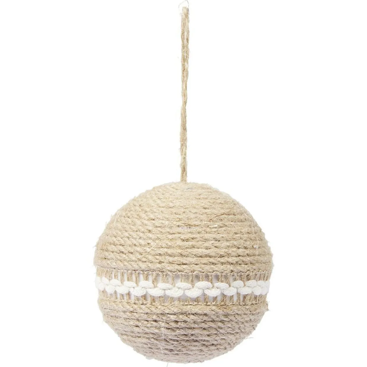 Boule de Noël en jute. Existe en 2 modèles (crochet central ou en) lignes), disponibilité selon stock en magasin.