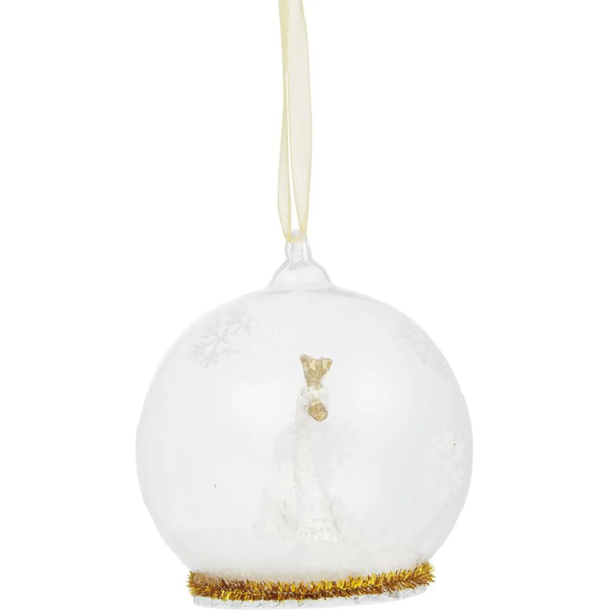 Boule de Noël transparente et dorée en verre à accrocher au sapin avec un joli cygne à l’intérieur pour un Noël chic.
