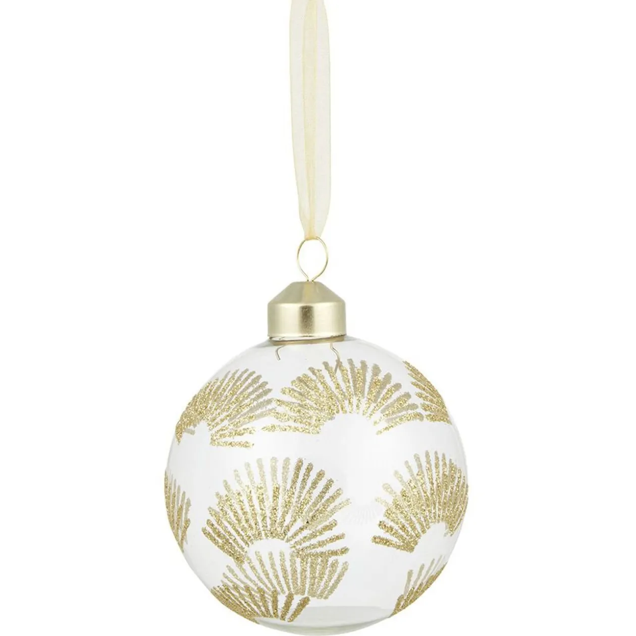 Boule de Noël transparente en verre à accrocher au sapin avec des motifs dorés évoquant les rayons du soleil.
