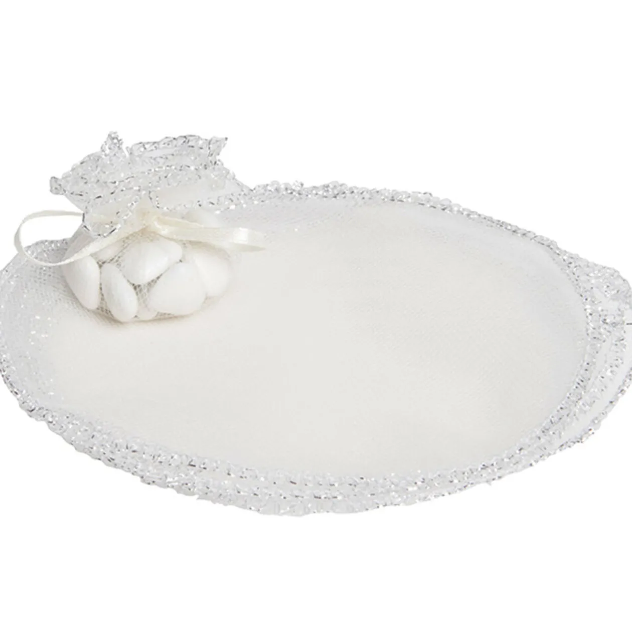 6 bourses rondes à dragées avec ruban, coloris ivoire, ø 15 cm, polyester. Vendu sans dragées.