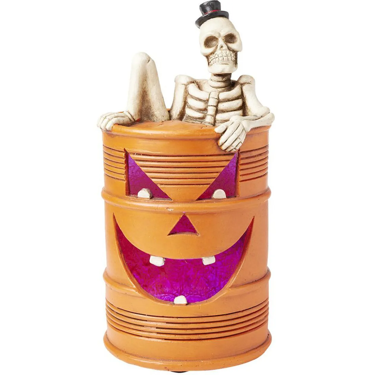 Cette décoration orange à LED rappelant la forme d’un baril avec un squelette qui en ressort est idéale à l’occasion d’Halloween.