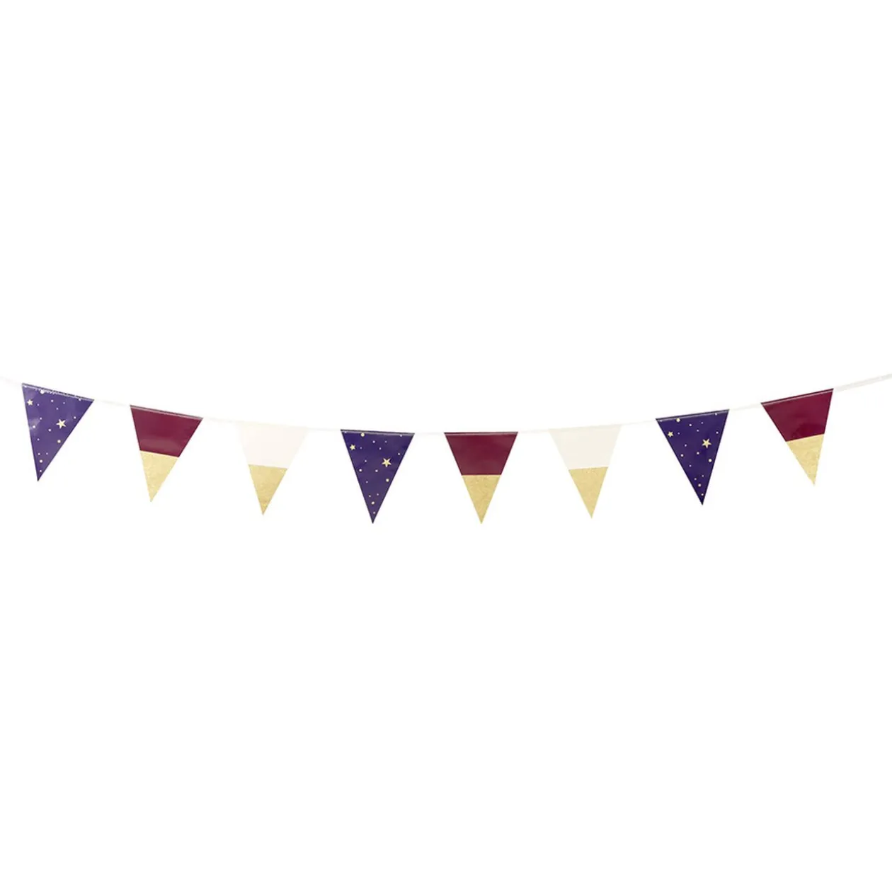 Apportez la touche finale à votre décoration festive avec cette guirlande à fanions bleu parsemés d’étoiles jaunes.