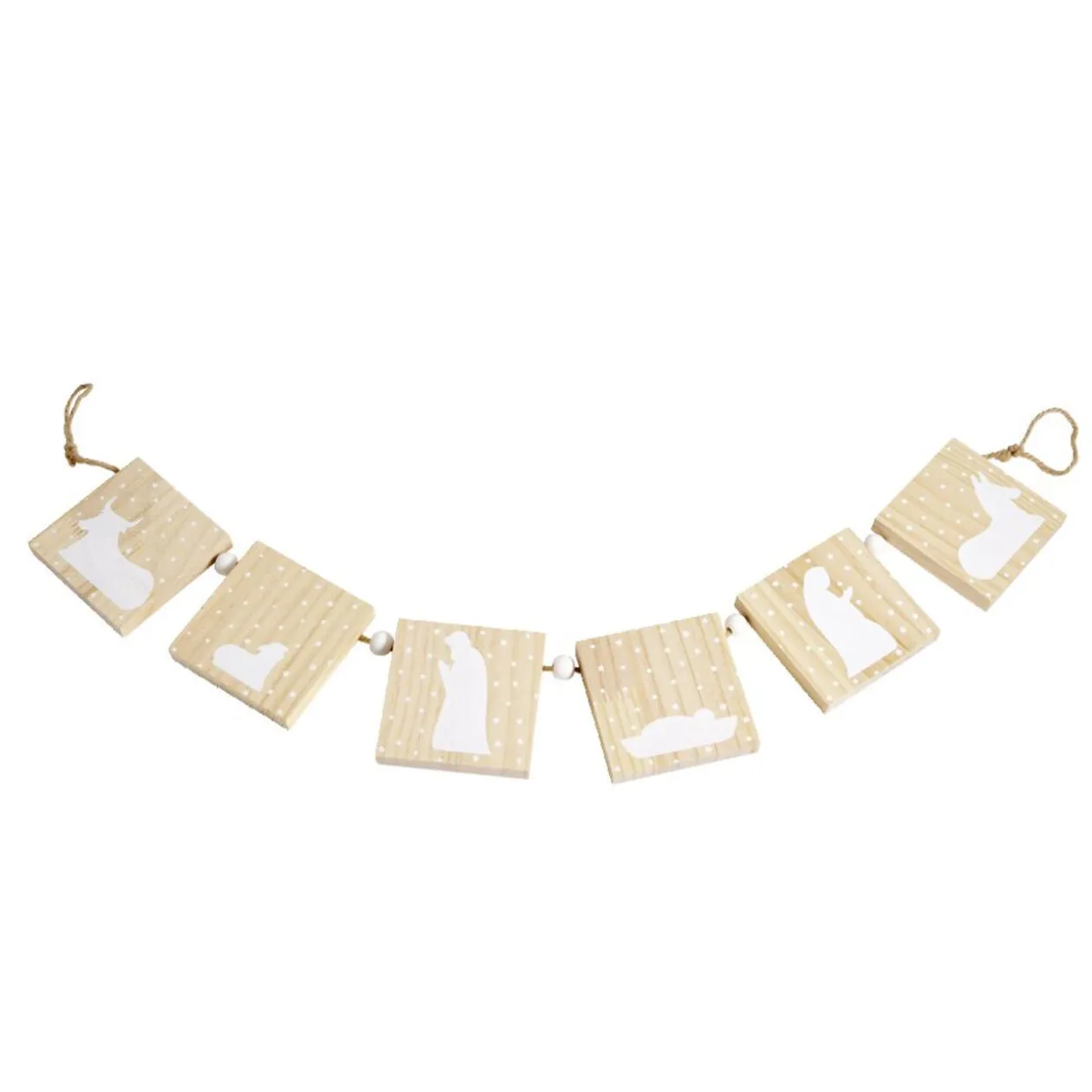 Cette guirlande en bois, composée de 6 carrés ornés de motifs de nativité, ajoute une touche spirituelle et élégante à vos décorations de Noël.