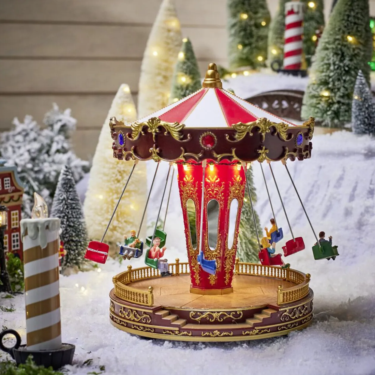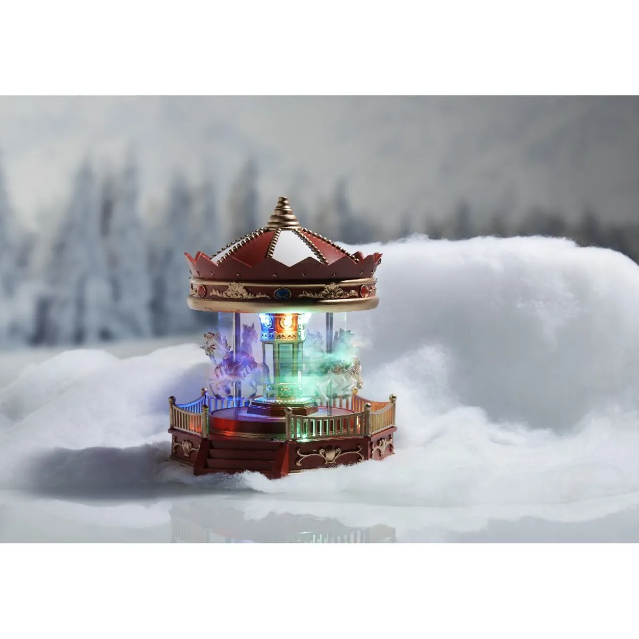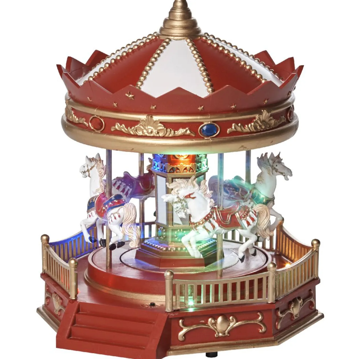 Manège animé, lumineux et musical de couleur rouge, blanc et doré.