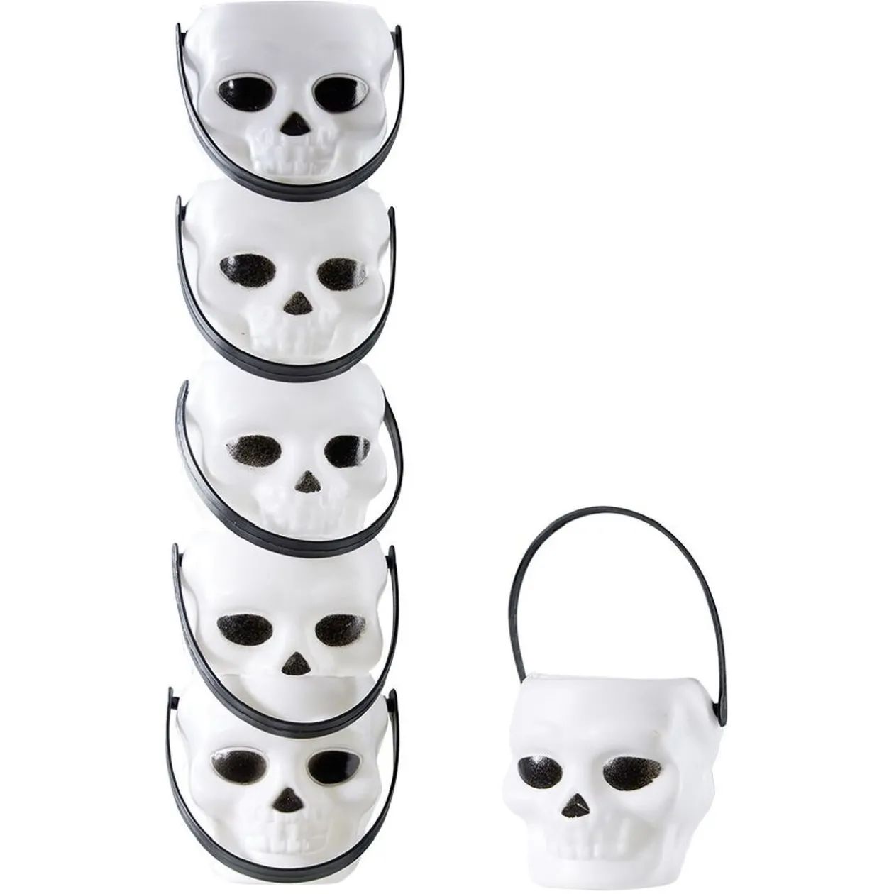 Ce lot de 6 mini seaux en forme de tête de mort noirs et blancs est parfait pour préparer des petits ballotins de friandises.