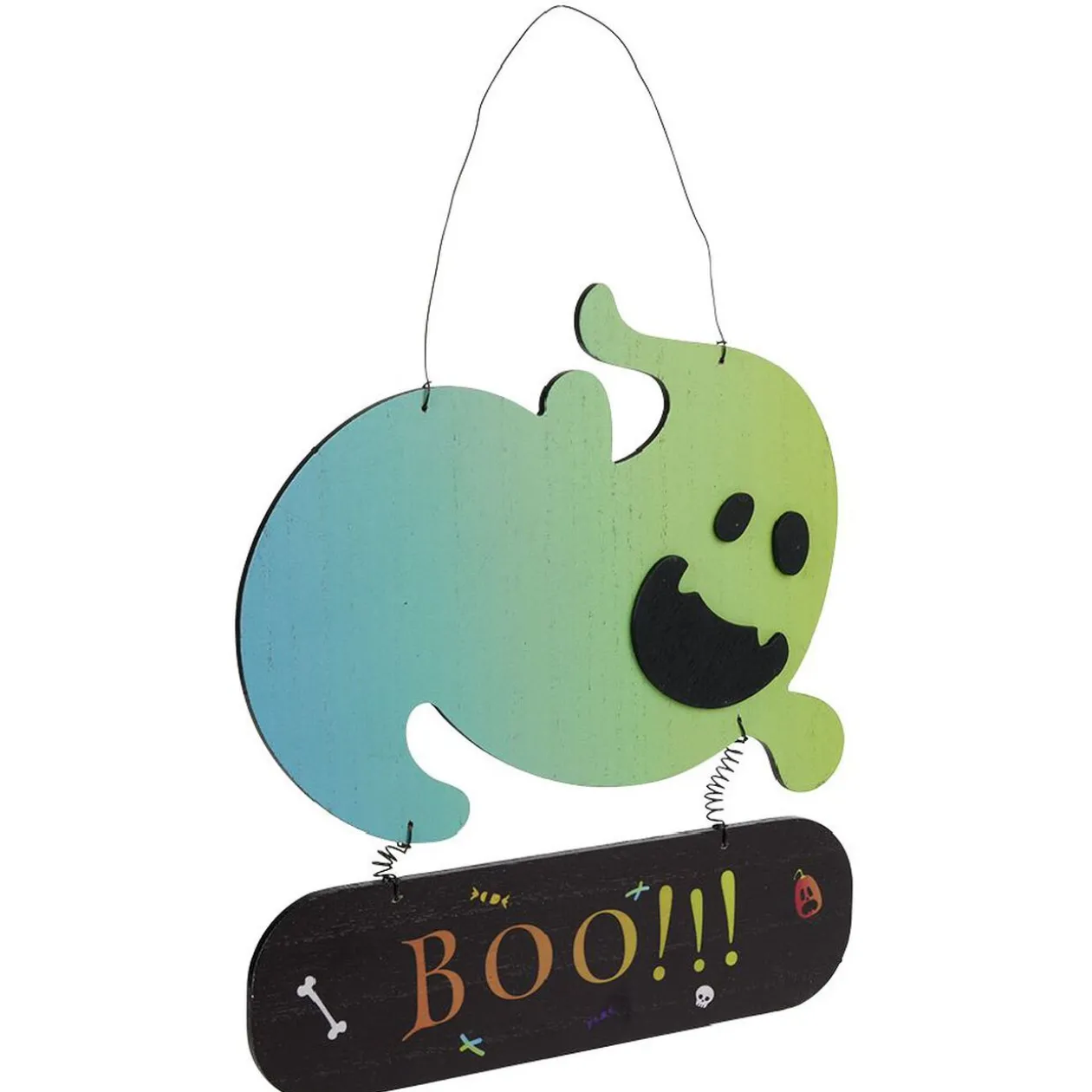 Pour la soirée d’Halloween, décorez votre porte d’entrée avec cette pancarte en bois en forme de fantôme avec inscription « boo !!! ».