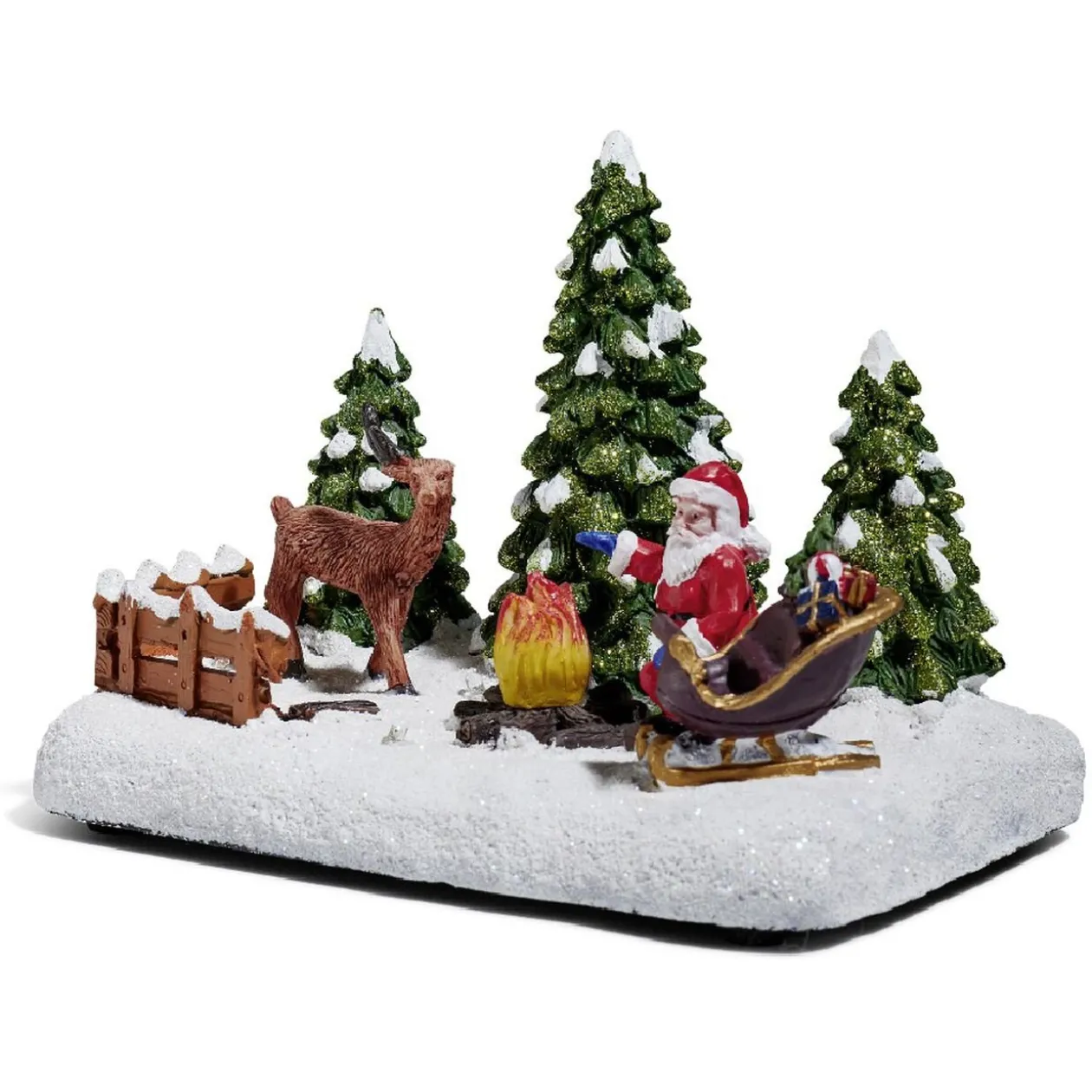 Père Noël et renne lumineux au bord d’un feu de bois sur la neige.