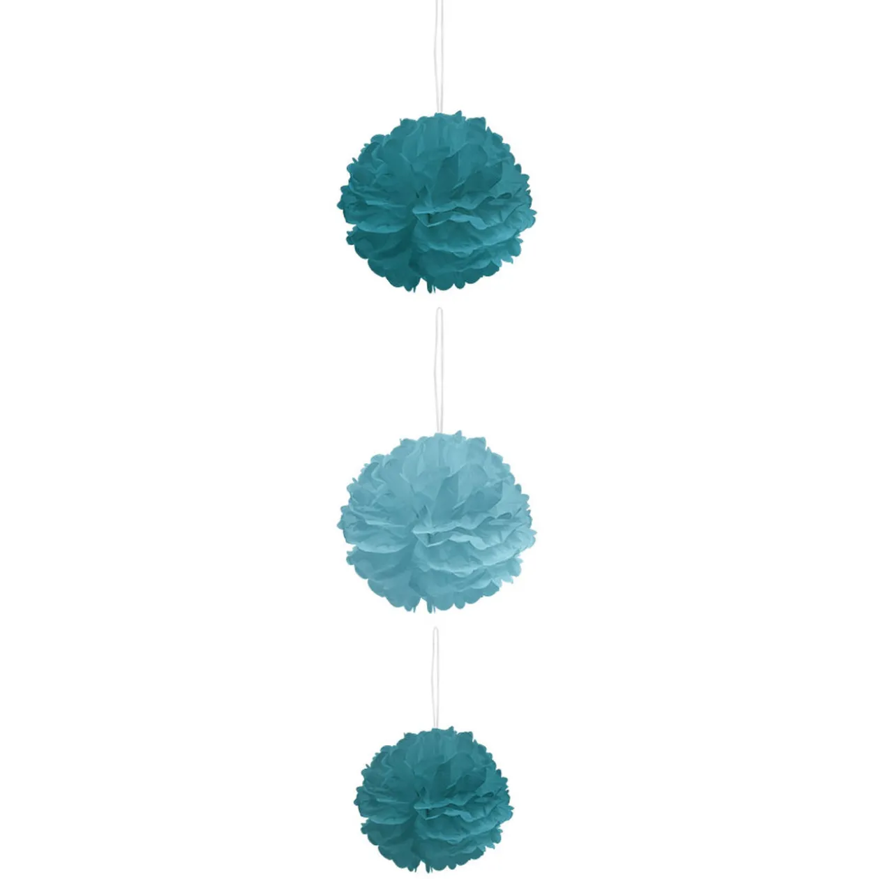 Lot de 3 pompons en papier bleu pour décorer vos soirées et évènements.