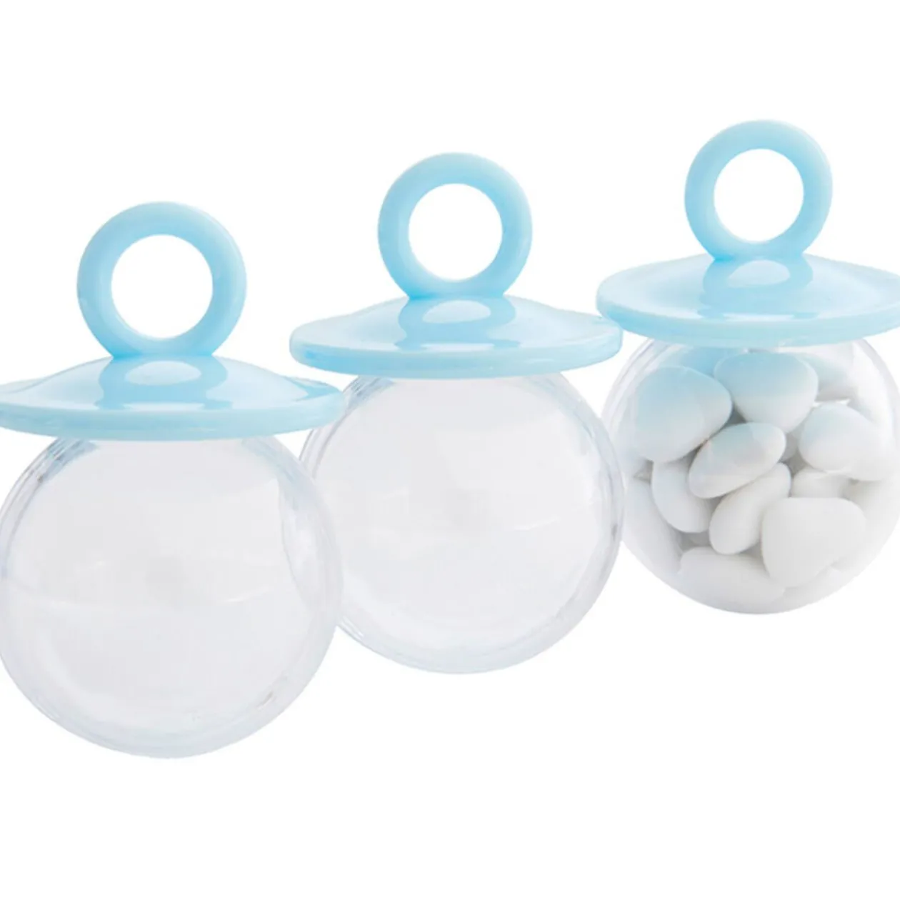 3 tétines à dragées bleus, dim. 4,5×7 cm, plastique. Contenant à dragées idéal pour votre baptême ou autre évènement. Vendu sans dragées.
